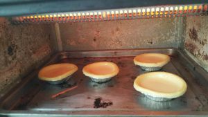 烤箱200度预热8分钟,放进蛋挞上下火中下层烤20分钟