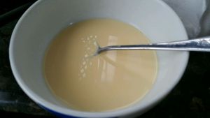 把牛奶、淡奶油、砂糖一起倒入奶锅小火,把糖熬化