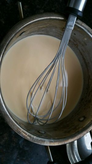 在小锅中加入牛奶和白糖,小火把白糖化开,用勺子搅拌!~不用煮开,温热能把糖化开就行!!!~