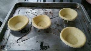 把挞水加入蛋挞皮中,八分满就好!!!~烤箱200度预热!~然后放入烤箱烤!~