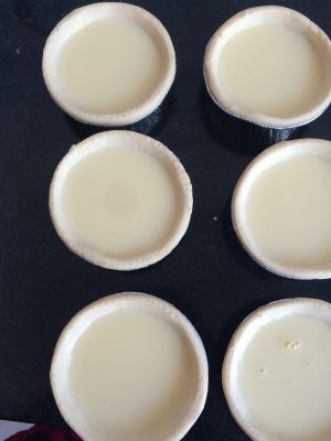 奶油,牛奶,白糖混合搅拌均匀,加入蛋黄继续搅拌均匀,然后筛入面粉搅拌均匀,蛋挞液制作完成,倒入蛋塔皮内