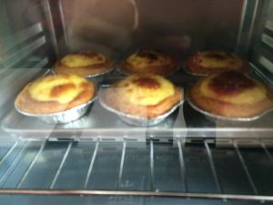 把烤箱调到210度 上下预热 然后把蛋挞盛到烤盘里 端进去