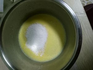 倒入蛋黄内(边倒边搅拌,避免蛋黄起坨。)再筛入吉士粉拌匀。