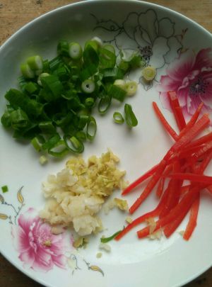 姜.蒜切未.葱切花.红椒切丝。