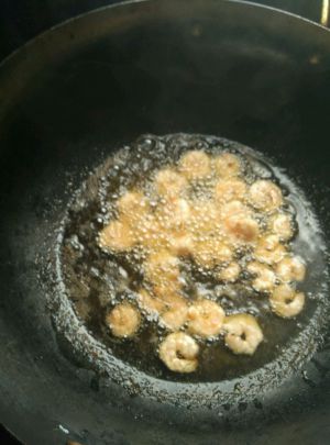 锅入油下虾仁炸熟捞出。