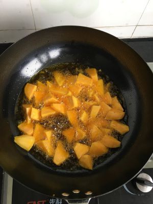 然后地瓜倒下去快速翻炒。捞起,