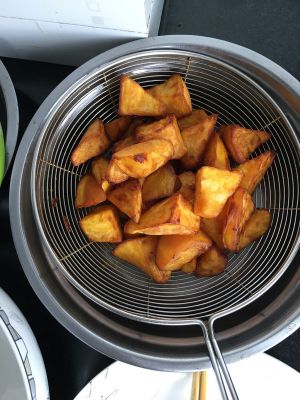 等油热到8分。地瓜放下去炸到金黄 捞起来