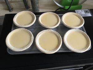 把蛋挞液倒入蛋挞皮中,约八成满。