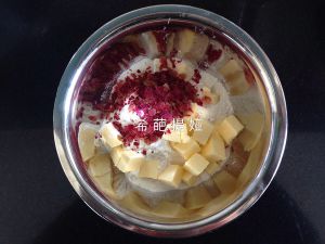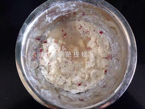 软化的黄油、低粉和1g揉碎的玫瑰花瓣放一起
