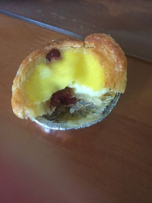 2、蛋挞皮内放入蔓越梅干,倒入混匀液,入烤箱220度15min,开吃