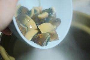 当大米煮至粘稠时,加入皮蛋块,煮15分钟。