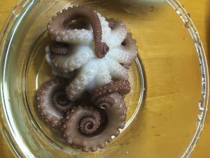 菠萝从四分之一个切开,取出果肉,留菠萝壳做饭碗,分别都用盐水浸泡五分钟。