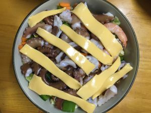起油锅,倒入海鲜。加入蒜蓉,白胡椒粉,盐,鸡精,稍微翻炒下即可。