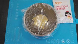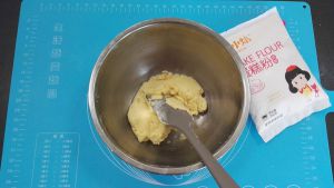 面粉过筛,加入打发的黄油中,用橡皮刮刀,将黄油和面粉压拌均匀,至看不到干面粉。