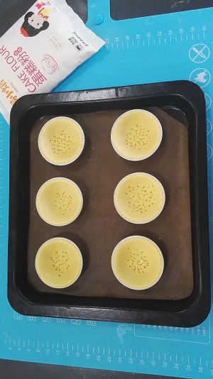 挞液倒入挞皮八分满,预热烤箱200℃上下火,下层200℃25分钟。