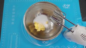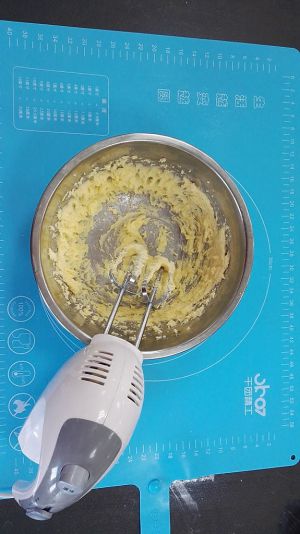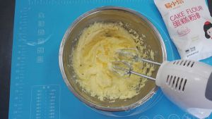 用电动打蛋器中速搅打,至黄油膨胀,如羽毛状态。