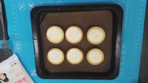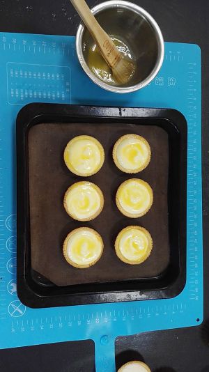 表面刷蛋黄;把烤箱以上火210度,下火150度预热10分钟。取出冻硬的芝士塔,在表面刷上打散的蛋黄液。把毛刷洗干净,在塔皮边上刷一些清水(这是我的小窍门,不然在烘烤过程中 塔边沿会烤焦哦)