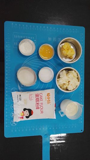 材料大集合。解冻蛋挞皮。蛋黄打在无油容器里,打散备用,牛奶及淡奶油放入奶锅,加入糖,小火至糖化,晾凉备用,蛋黄液倒入牛奶中,搅拌均匀,蛋液完成。