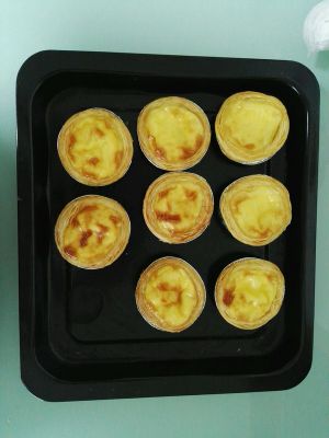 烤箱上下管200度,预热5分钟。烤盘放入烤箱中层,30分钟。看到蛋挞表层变成金黄色,且有几点焦糖色就可以了。