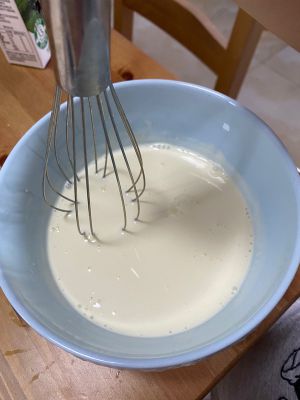 将之前的奶油牛奶溶液倒入鸡蛋糊中,搅拌均匀。
