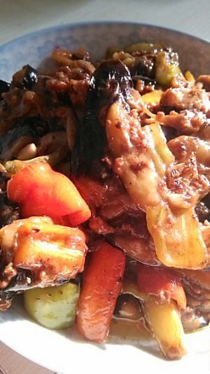 开火,爆香姜和1/2蒜(所有蒜末的一半),然后下肉馅炒散,继续下葱碎炒香,把步骤2备用的混合液倒下锅,然后加一碗清水、1羹匙豆瓣酱翻炒,水开以后倒入菜椒青椒和茄子,继续翻炒2分钟,最后搁1匙半的醋,并把淀粉水倒入炒1分钟,就可以上菜了。