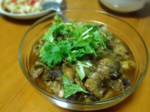 锅中余油不要太多,下蒜末爆香,放肉,加一大勺豆瓣酱开炒,肉发白时加酱油再以老抽上色,将之前的茄子加入煸炒,加适量盐调味后即可出锅。然后撒香菜就好了。