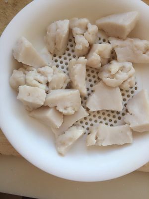 取出切块。用另一个盆倒入面粉、淀粉、鸡蛋、水做成糊状
