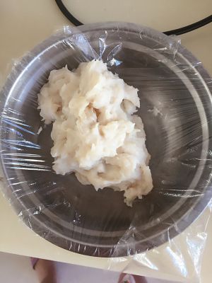 低筋面粉加泡打粉倒入适当的水调成厚面糊待用。取出奶冻切成小块。