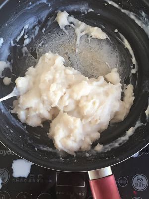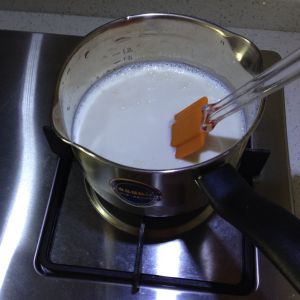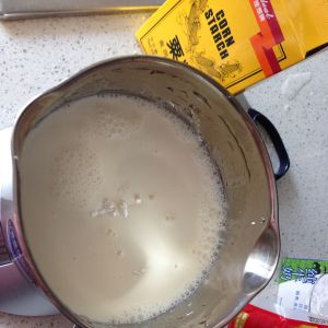 玉米淀粉、牛奶、炼乳和砂糖混合均匀后一边搅拌一边加热,直至厚浆糊状离火。
