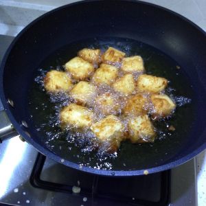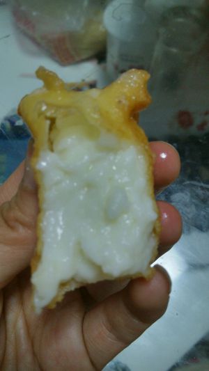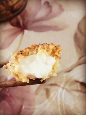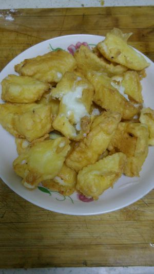 用鸡蛋,面粉,少量水,调出面糊,最好稠一点,牛奶块滚面糊放到锅里炸,小火炸~