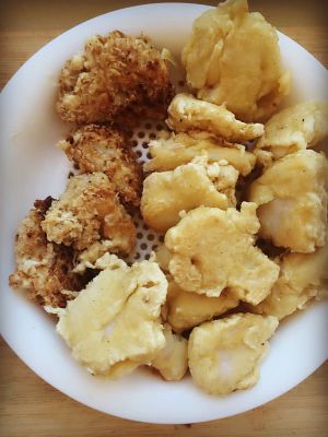 用小火煎炸。做了两种。裹了燕麦片的。和没裹的