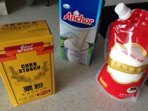牛奶250g+淀粉30g+砂糖或白糖30g 搅匀。