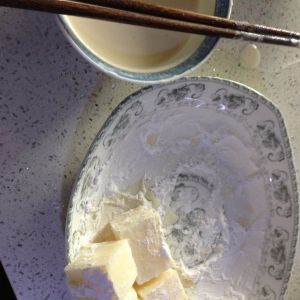 牛奶块先裹淀粉,再裹蛋液,最后裹面包糠