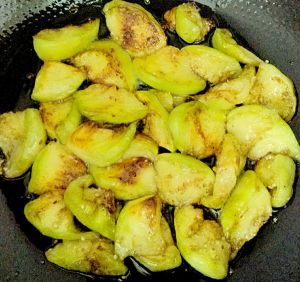 加入攥出水份的茄块,火不要太大,慢慢煸炒至茄块微微发黄变软,盛出备用。