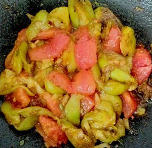 再加入茄子继续煸炒,待西红柿炒出汤汁(如图)