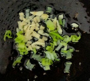 锅内留少许油放入葱、姜沫,煸炒出香味。