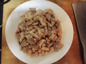 将五花肉入冷水煮十分钟(去除肉腥味),捞出,切成如图的小肉丁,这样最后做出的卤肉肉粒分明,有卖相。