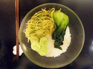 在煮炖的时间里制作配菜。青椒土豆丝,耗油小油菜。切小油菜的时候发现切下来的菜蒂很有美感,就拿来摆盘了。