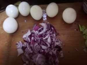 将大葱,洋葱,切碎。姜切片。鸡蛋煮熟(水煮5~7分钟)放到冷水中冷却,去壳。