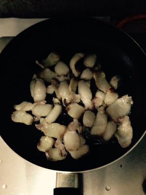 炒锅去水烧热,放入肥肉煎炸,肥肉炸至微黄,把锅底多余的油盛起来,油不需要那么多。