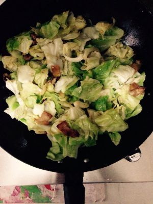 第三步,将洗好的圆白菜倒入锅中,大火炒至水份蒸发,倒入生抽,加少许盐,出锅