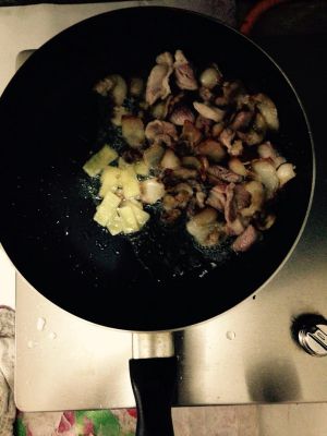 把瘦肉放进锅里翻炒至肉变色,将肉拨到一边,放入生姜热油烧一下,翻炒肉丁几下,倒入料酒,老抽酱油,生抽,半勺盐,让肉提味,着色。