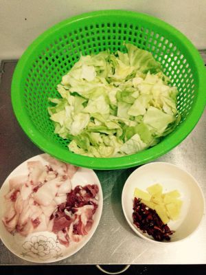 准备好食材:五花肉切片,肥瘦分开,把肥肉煎炸一下去油,这样不会油腻,包菜手撕好沥干水分,姜和辣椒切段。