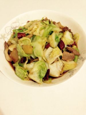 肉翻炒1分钟后放入辣椒(辣椒可以和生姜一起放,但是那样肉会有点辣)再放入沥干水的包菜,加入一勺半盐,生抽,黄豆酱翻炒2分钟左右,放点鸡精,白胡椒粉翻炒几下就可以了。