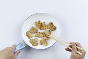 锅中放油烧至五成热时放入五花肉片小火煎出油,放少许盐后盛出。