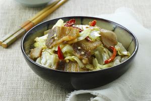 锅中留油,烧六至成热将辣椒段和大蒜片炸出香味,调至大火,放入牛心菜爆 炒至半熟,放入五花肉片、香醋翻炒均匀即可出锅。