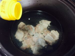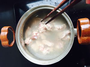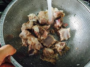 排骨洗干净之后,冷水下锅煮沸捞出,重新换一锅水(水可以稍微多一些,因为我不是用的压力锅,所以要小火慢炖)。