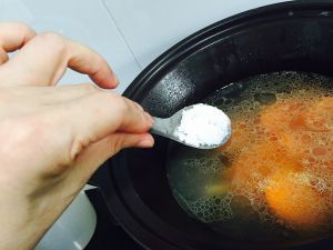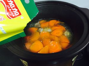 又过半小时,排骨炖烂了,胡萝卜也熟了,加入盐。