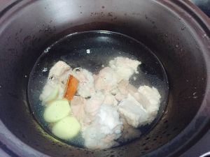 加入姜(最好把姜拍烂一些,这样更好提味),少许花椒(因人而异,我个人喜欢花椒的味道,可以增加汤的香味),大火烧开后,转小火慢炖30-40分钟。