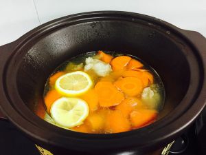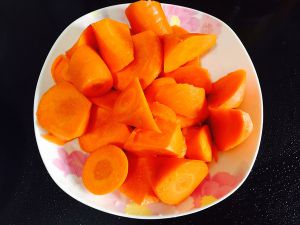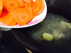 大约一个多小时,排骨骨质炖出些后,倒入胡萝卜。